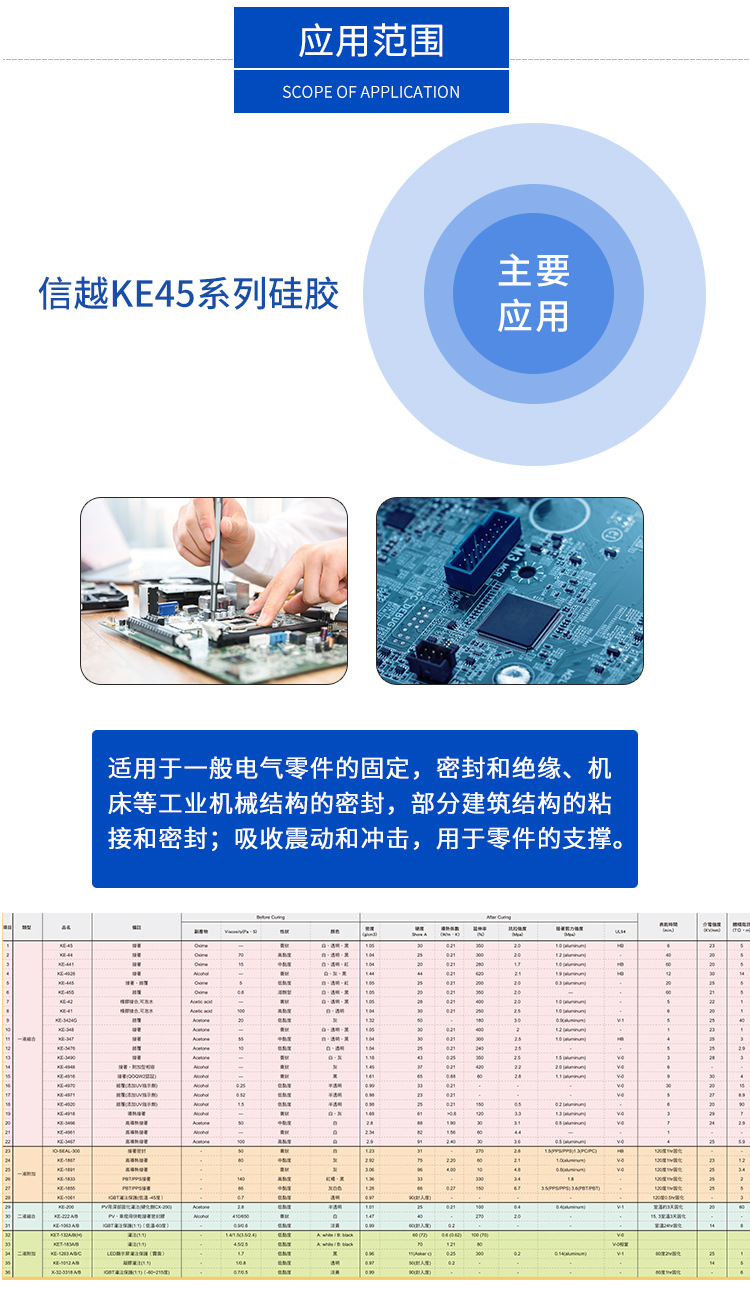 日本信越ShinEtsu: 接著及密封RTV橡膠:1. 一般電氣用(KE-348、KE-347、KE-45、KE-44、KE-441、KE-4897),2. 難燃性(UL合格品)(KE3490、KE3494、KE40、KE4890), 3. 導(dǎo)熱性(KE3493、KE4560),4. 超耐熱性(KE3418、KE3417),5. 導(dǎo)電性(KE3491、KE3492),6. 耐油劑及溶劑性(FE123、FE61),7. 塑膠用(KE4525、 KE4805),8. MIL合格品(KE3498、KE3497),9. 快速硬化用(KE1820、KE1830),10. 一般工業(yè)用(KE42、KE41) 。披覆膠:1.一液型有機(jī)硅灌封膠(KE1842、KE1056)。灌封膠:1.一液型有機(jī)硅灌封膠(KE1842、KE1056),2. 二液型有機(jī)硅灌封膠(KE1204B、KE1204BL-A、、KE1800). 硅油: KF-69、KF-96、KF-99硅油。散熱膏(導(dǎo)熱膏)及潤(rùn)滑脂、阻尼油、真空密封脂:X-23-7783D、X-23-7762、G-751、G-747、G-746、G-501、G-330、G-332、G-353、G-633、KS-64、KS-612、KS-609、G-30M、G-40M、HIVAC-G