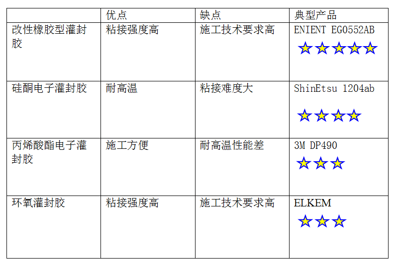 第三種類(lèi)型是聚氨酯灌封膠。聚氨酯灌封膠具有很好的耐磨性和耐沖擊性,同時(shí)具有較好的耐高溫和耐化學(xué)性能。但聚氨酯灌封膠的耐候性和絕緣性相對(duì)較差。知名品牌包括ENIENT、Huntsman、Lord等。