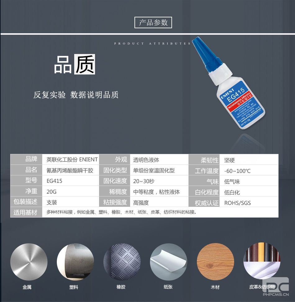 ENIENT EG415快干膠金屬塑料橡膠紙張皮革紡織材料20-30s固化無白化透明20G