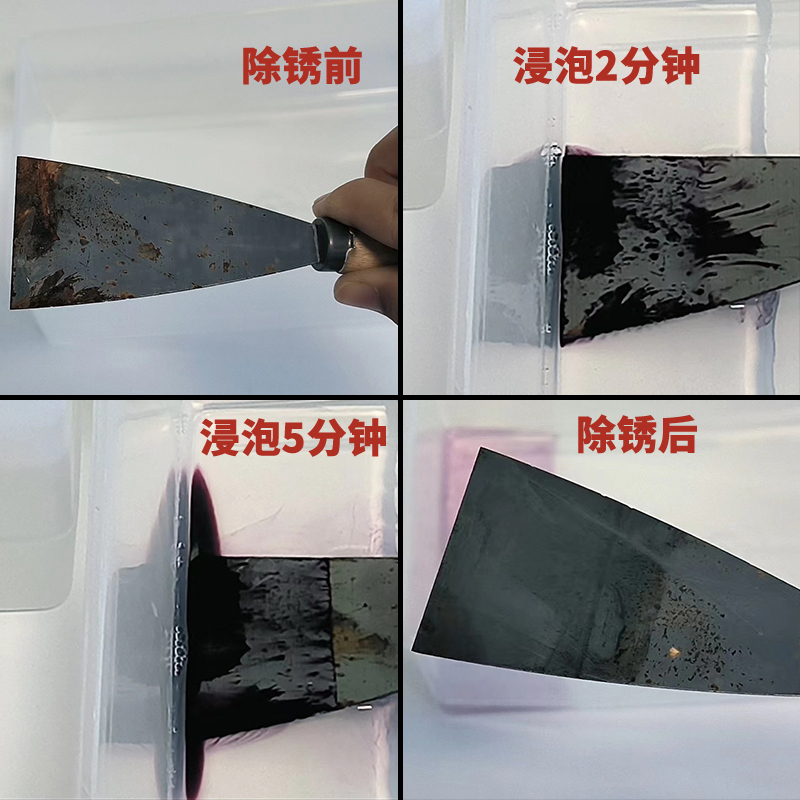 2. 需要浸泡有效,大約浸泡6小時(shí)左右能夠徹底的清除銹漬,但是除銹效率較高。同樣的除銹劑能夠清除更大量的銹蝕。除銹劑更換頻率較低,更高效率。這種中性除銹劑采用跟前一種同樣的原理,只是在配比上,有效成分更多,配方更為優(yōu)秀。