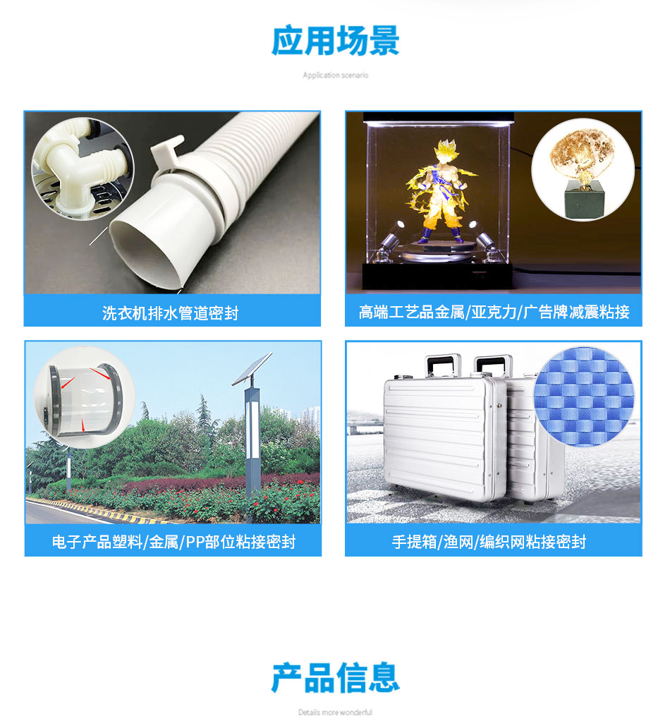 · 粘結(jié)、固定、密封、防潮防水、結(jié)構(gòu)性粘接等方面。特別適合 PP 材質(zhì)的固定防水密封。