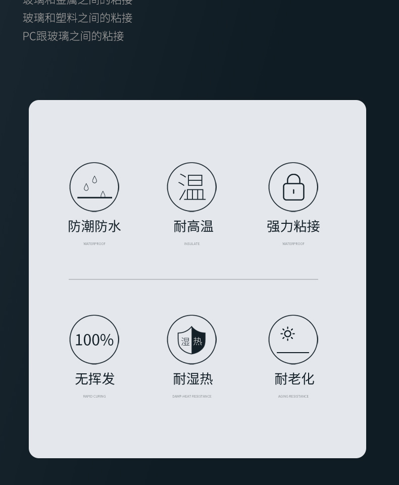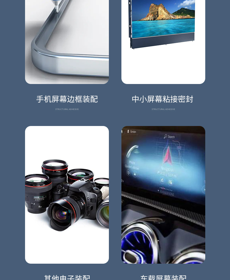 · 電子電器部件的粘接、固定、密封,不同基材的高強(qiáng)度快速粘接和定位。