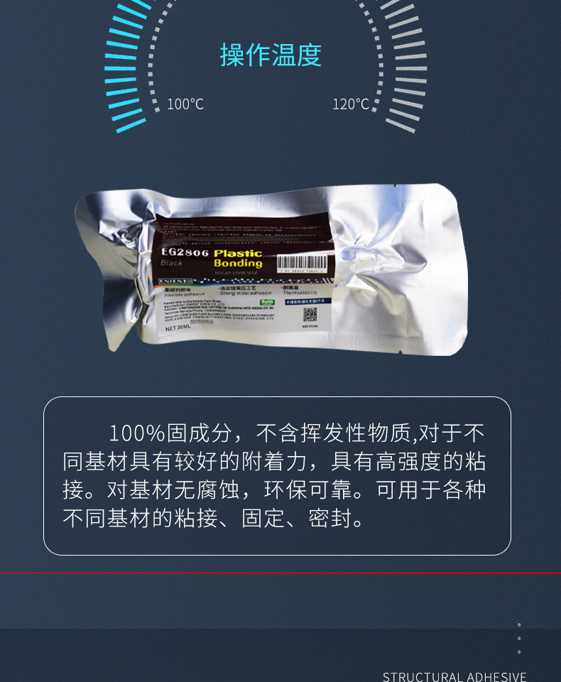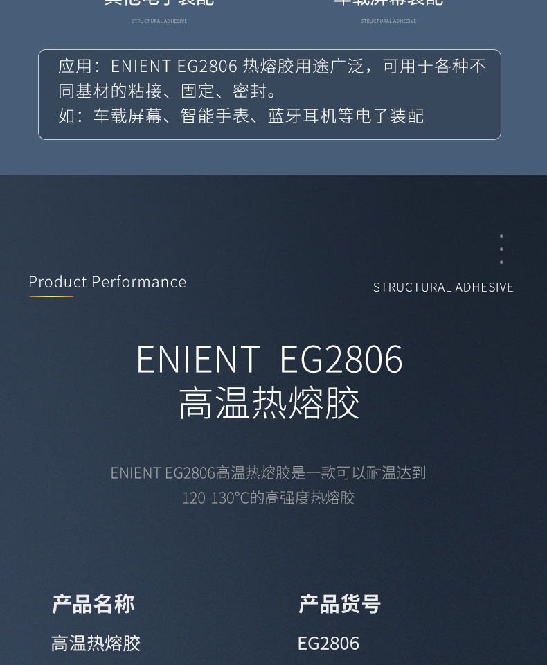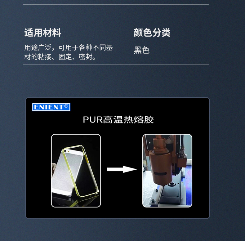 ENIENT EG2806熱熔膠用途廣泛,可用于各種不同基材的粘接、固定、密封。應(yīng)用· 電子電器部件的粘接、固定、密封,不同基材的高強(qiáng)度快速粘